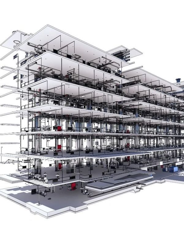 Comprehensive mechanical, electrical, and plumbing system modeling covering HVAC ductwork and equipment, electrical conduits and panels, plumbing fixtures and piping, fire protection systems, and lighting layouts.